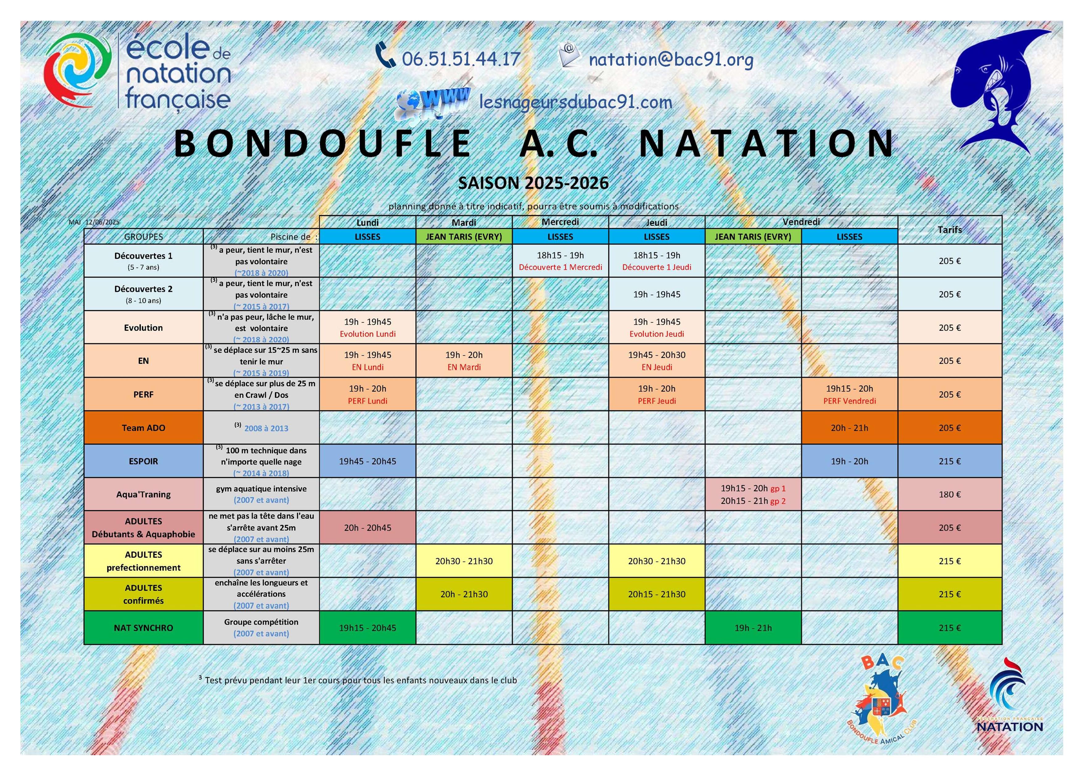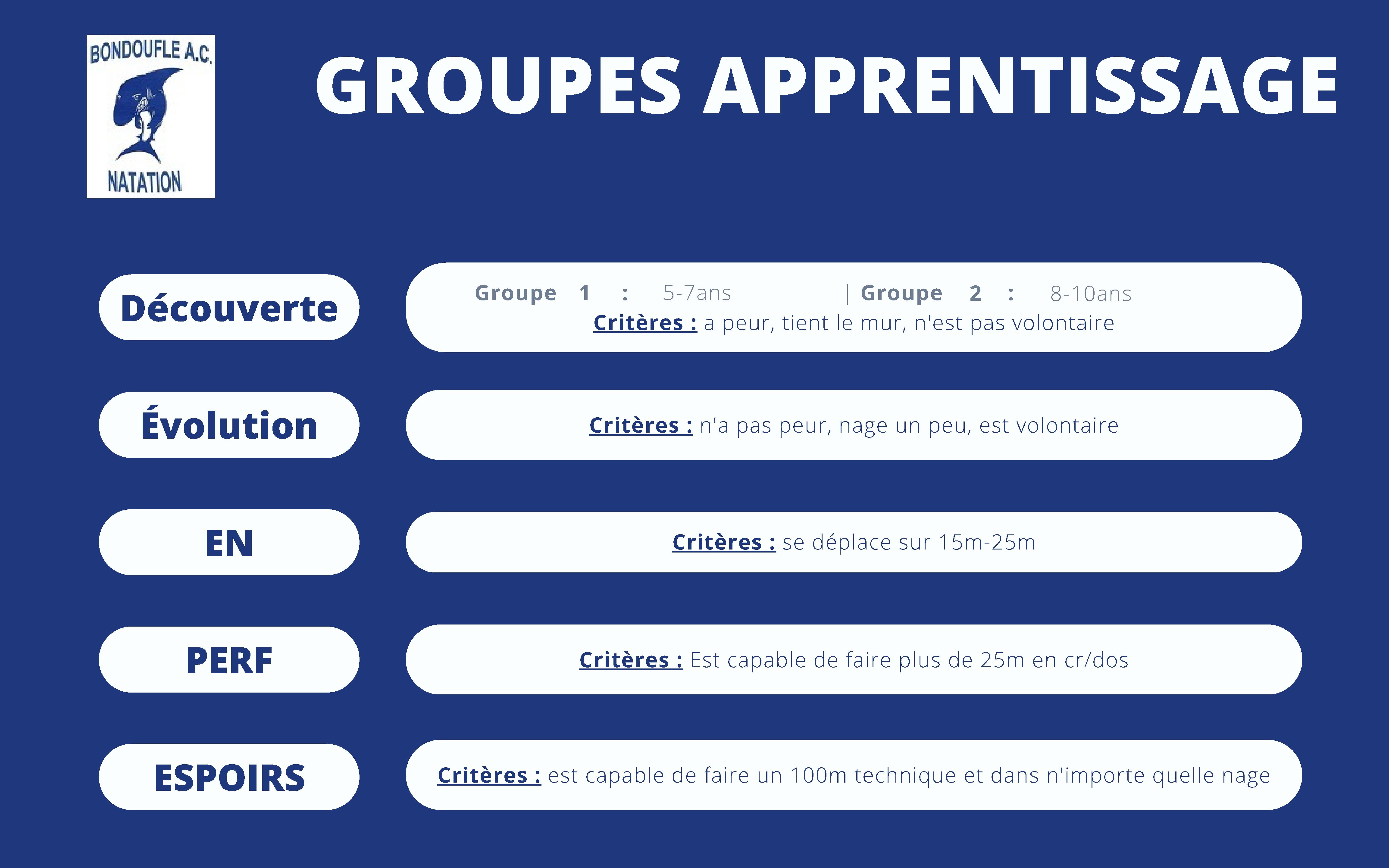 - Vous pouvez essayer d'identifier le groupe de niveau de votre enfant avec le document "Définition des groupes" (ci-dessous) et voir sur le "Planning" où et quand nage le groupe identifié.